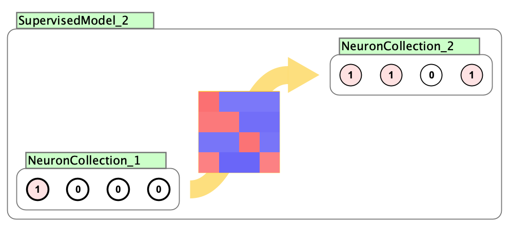 Supervised models support “immediate learning”, which allows you to instantly train an association between the current source and target activations. Simply create the model, press L, and the network learns by one increment, treating the current activations of the source and target as a single training example. You can see the association form visually as the weight matrix colors change with each learning step. Repeatedly press L to continue training the association.